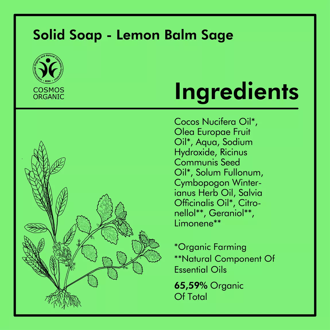 Die Melisse-Salbei Duschseife besteht zu 100 % aus natürlichen Inhaltsstoffen – zertifiziert nach dem COSMOS Organic Standard. Besonders hervorzuheben ist die Verwendung von Solum Fullonum (Fullererde), die der Seife ihre charakteristische grünliche Farbe verleiht. Fullererde ist für ihre hautberuhigenden und absorbierenden Eigenschaften bekannt und gilt als eines der sanftesten Naturprodukte zur Hautreinigung.