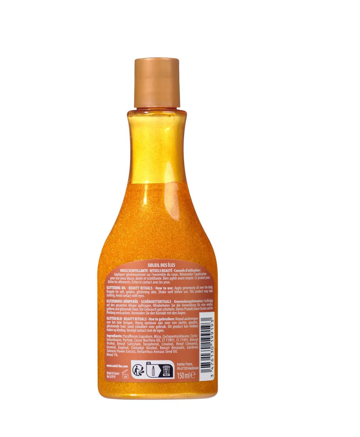 Das Soleil des îles glitzerndes Körperöl kombiniert sorgfältig ausgewählte Inhaltsstoffe, die Hautpflege und Schimmereffekt vereinen: